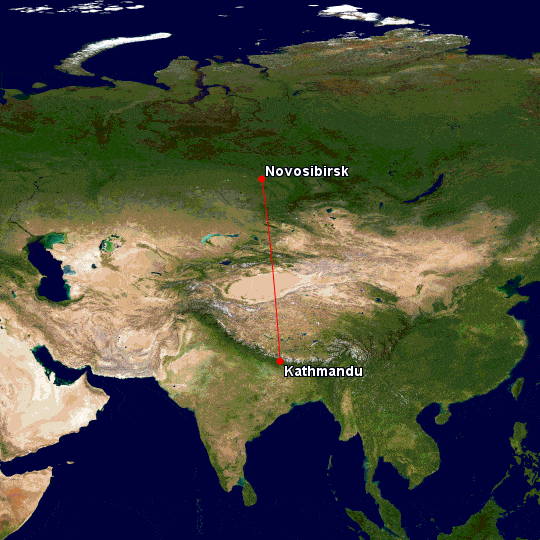Интересный факт, если лететь напрямую, то расстояние от Новосибирска до Катманду всего 3044 км (а от Барнаула и вовсе 2854 км), это даже меньше, чем мы преодолели по дороге на Иссык-Куль! Но, пути облета неисповедимы, и в итоге нам придется пролететь 9495 км, чтобы оказаться у цели. И да, это в одну сторону…