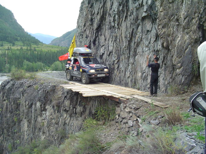 Есть еще ряд дорог местного значения и покрытие на них гораздо хуже.Часто на картографических сервисах отображаются несуществующие дороги. Например, дорогу Инегень — Тюнгур карты Google рекомендуют для проезда в Тюнгур и Усть-Коксу. Но на деле это пешая тропа, проходящая по узенькой полке над рекой. Автомобили здесь прошли лишь однажды. Но это был эксперимент новосибирского off-road клуба. Машины были максимально облегчены. В частности с них сняли двери, чтобы водитель и пассажиры могли быстро покинуть салон, если автомобиль вдруг упадет в пропасть. А дорогу пришлось буквально строить из подручных материалов.